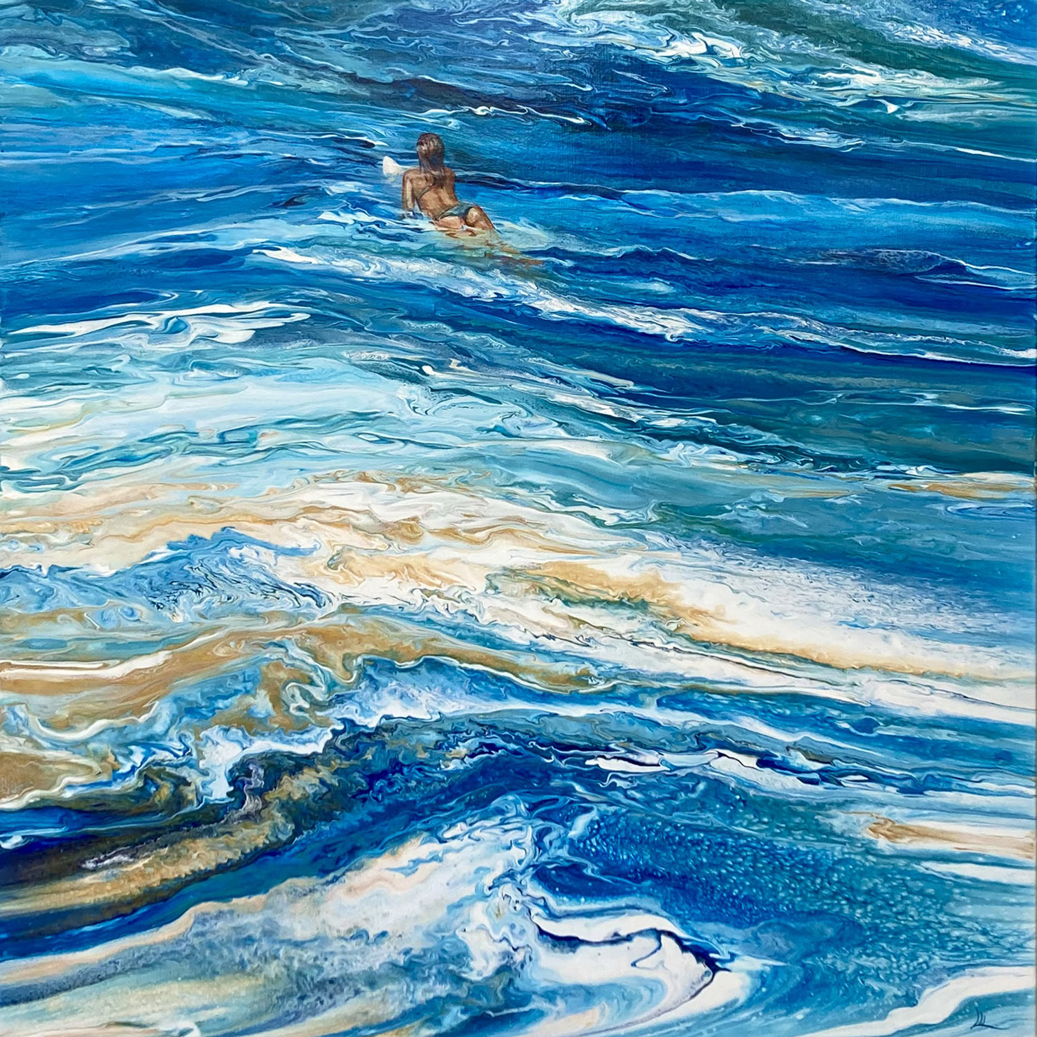 Starting with fast flow acrylic paint and pouring medium on canvas, I tilted the canvas, allowing gravity to give the paint the shape of waves. I included some metallic gold to represent stirred up sand and was very happy with the way it contrasted with the blues of the water. It still needed something to give a sense of scale to the sea so I included a surfer swimming out to catch the monster wave that seemed to be forming. I called the painting Big Swell in reference to the wave that hadn't yet broken and only later when it was hung realised the other funnier connotations with the surfer's bottom so obvious!