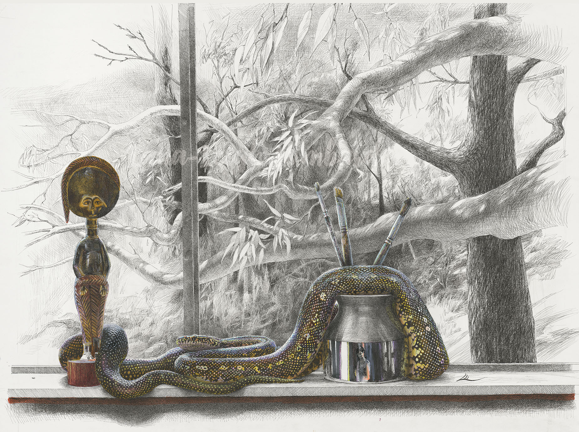 This is a pen drawing of an Australian Diamond Python that regularly sneaks into my studio and suns herself on my window sill, knocking almost everything off in the process. Only the vase - because it is super heavy and the African statue, which is attached with a big dollop of blue tack, were safe from her.