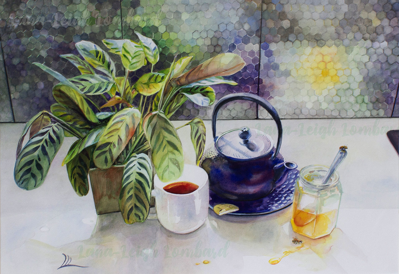 This is a still life that I did as a homage to peppermint tea mornings with a dollop of honey. I loved the morning sunlight on my kitchen counter with the teapot and teacup and reflections on the hexagon tiles.